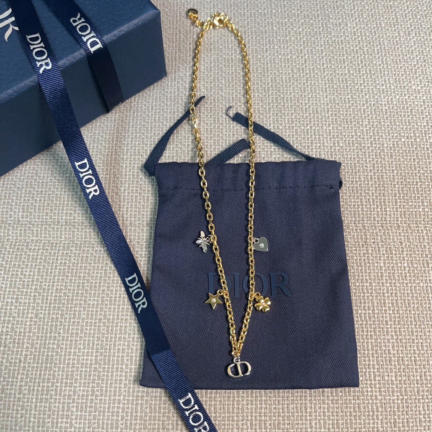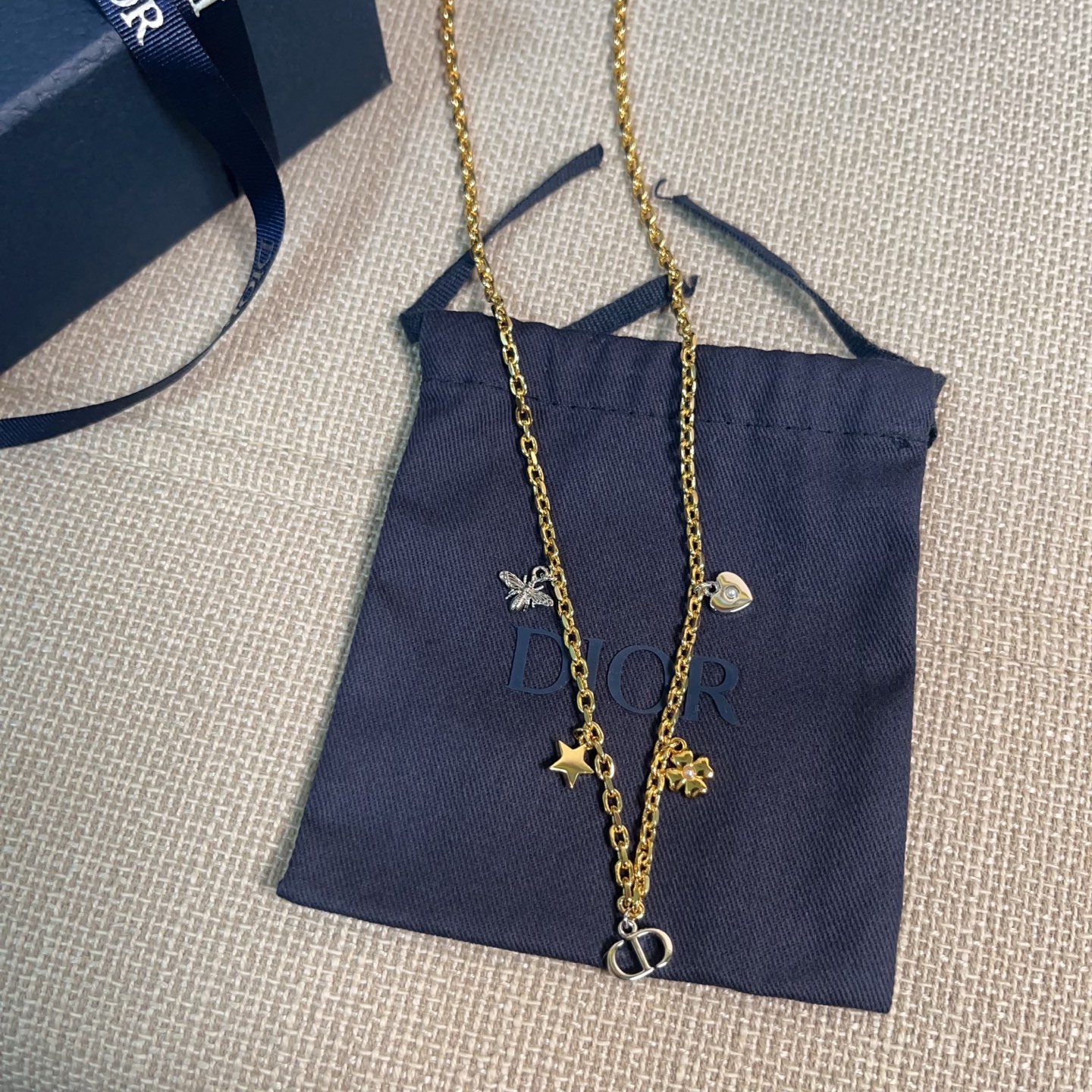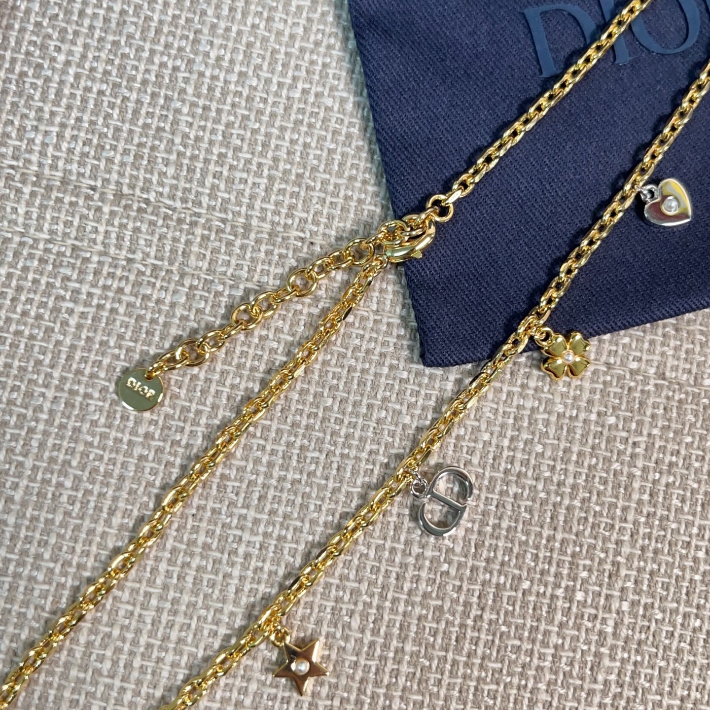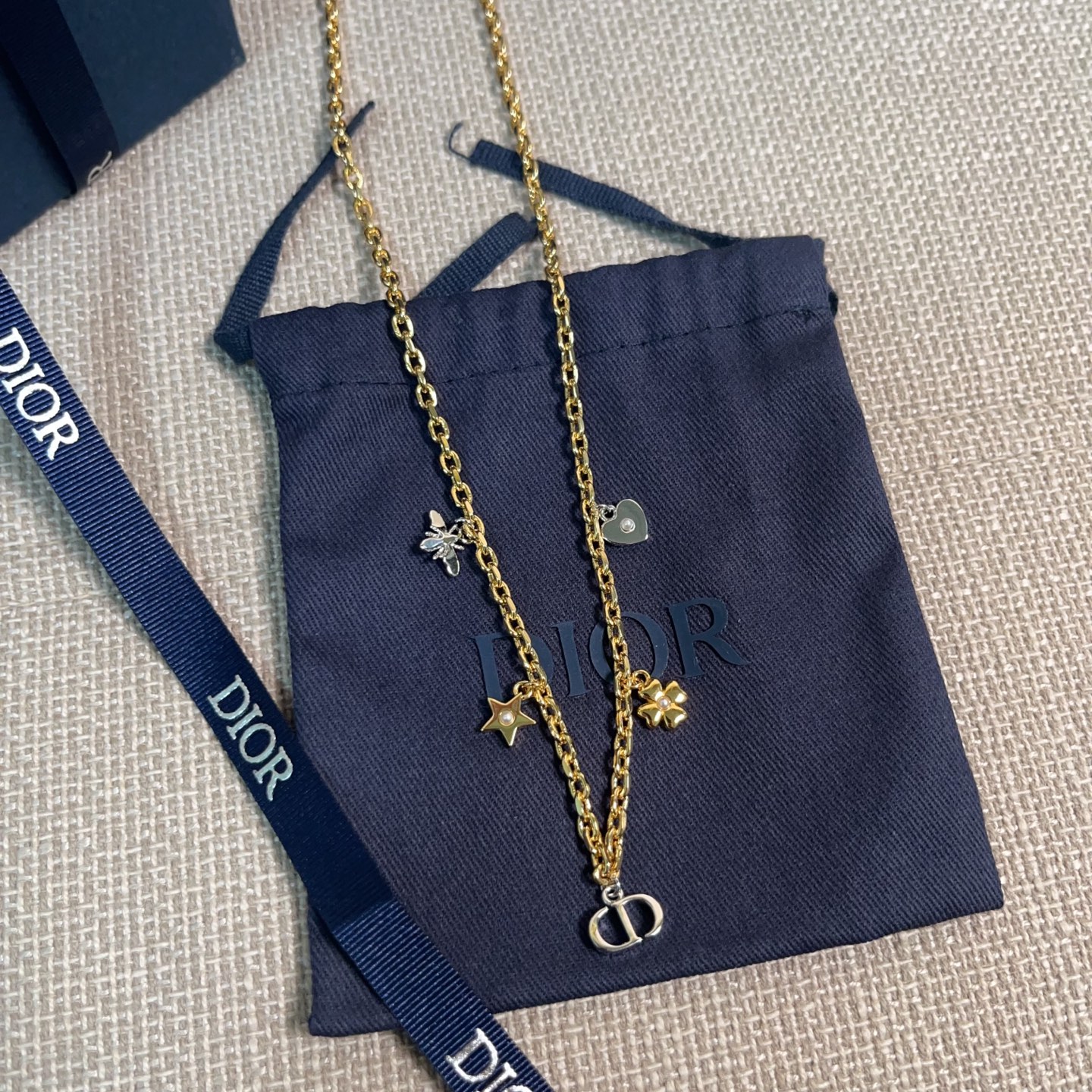 這條項鍊集結了多種經典元素:CD字母標誌、閃亮水鑽、珍珠點綴、星星、愛心、四葉草與蜜蜂吊墜,每一個細節都充滿巧思與象徵意義。