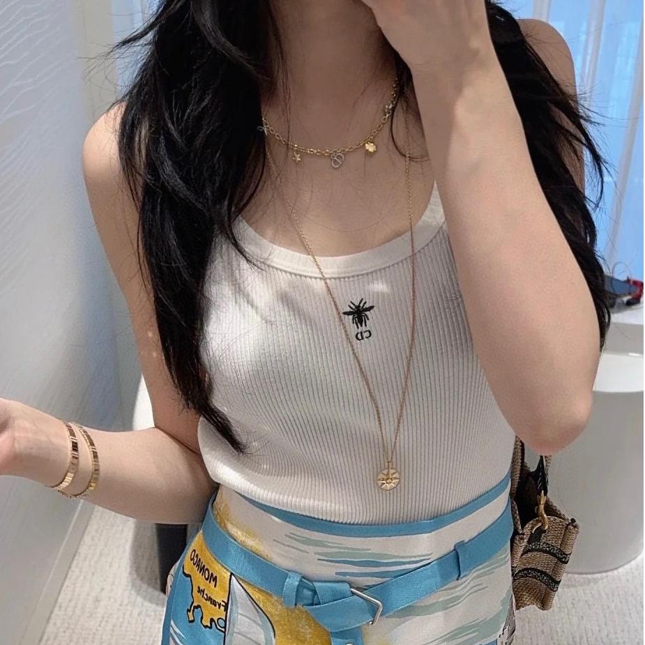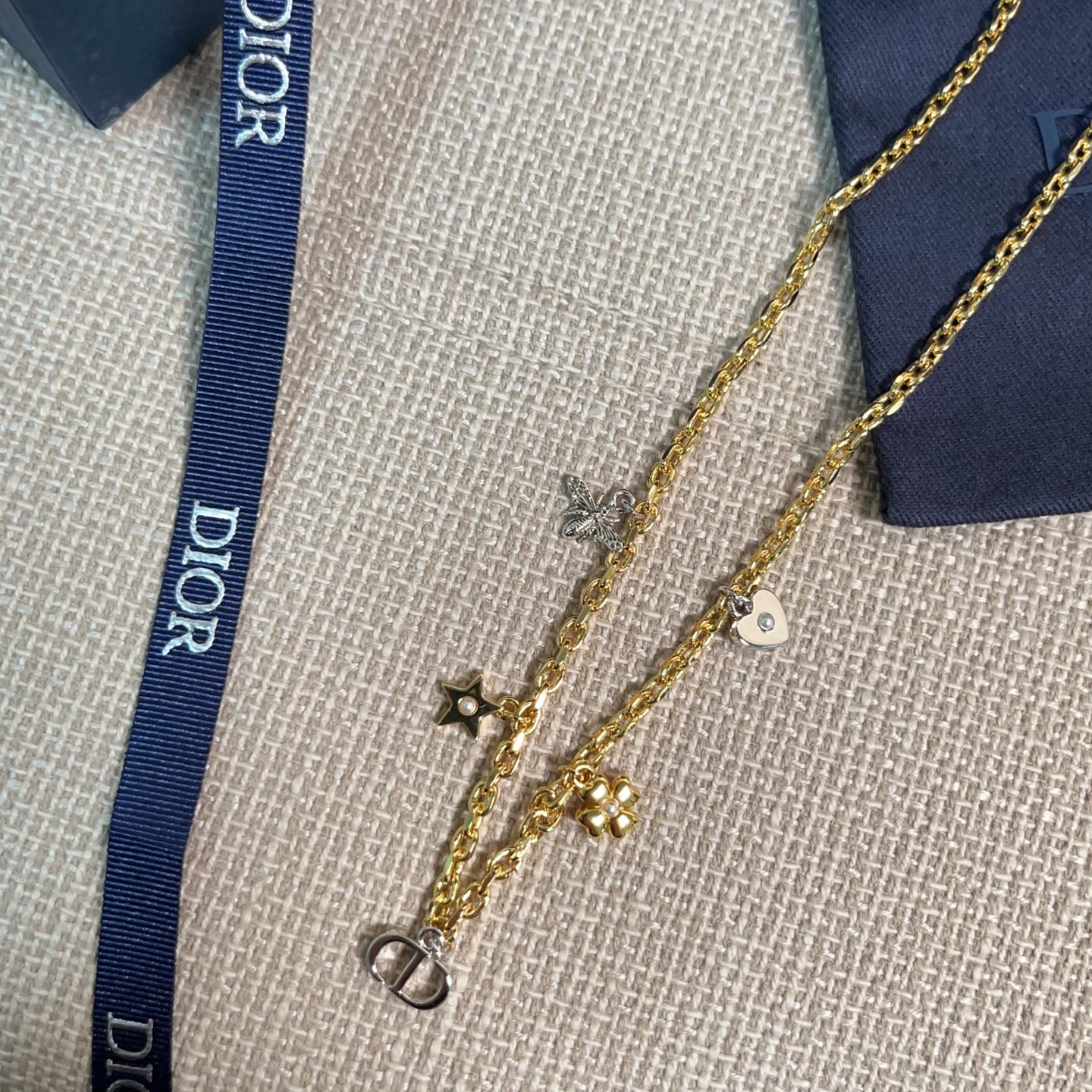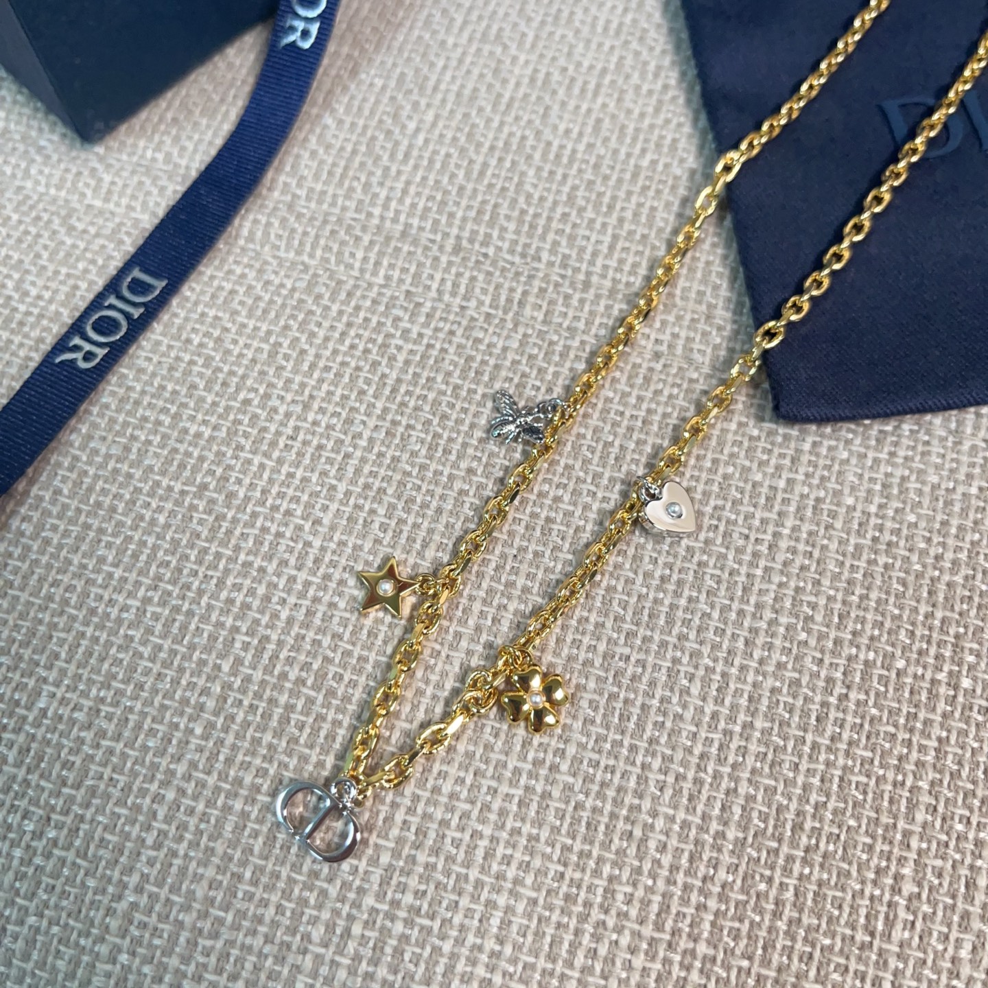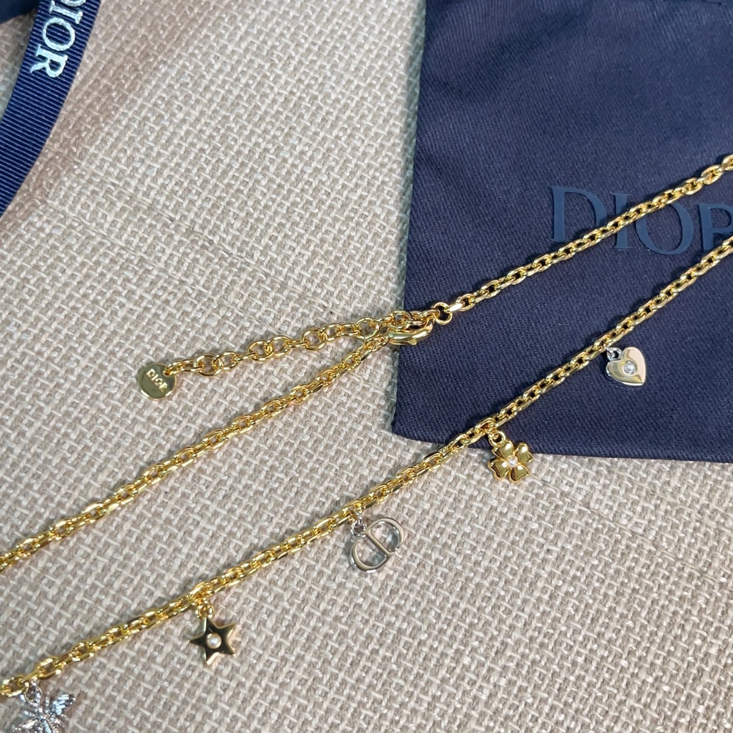 這條項鍊集結了多種經典元素:CD字母標誌、閃亮水鑽、珍珠點綴、星星、愛心、四葉草與蜜蜂吊墜,每一個細節都充滿巧思與象徵意義。