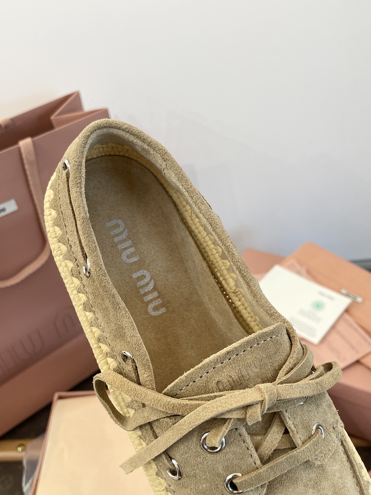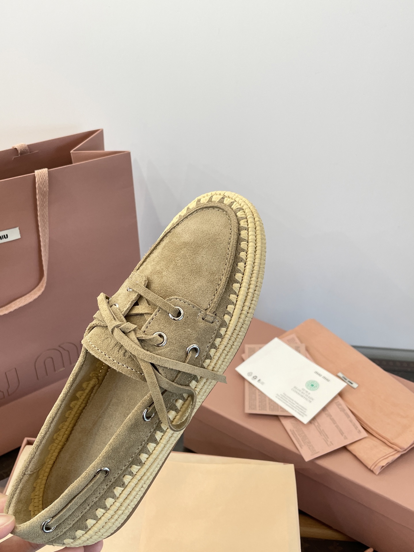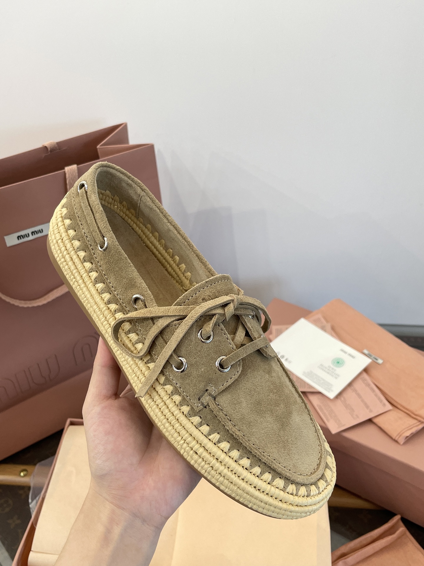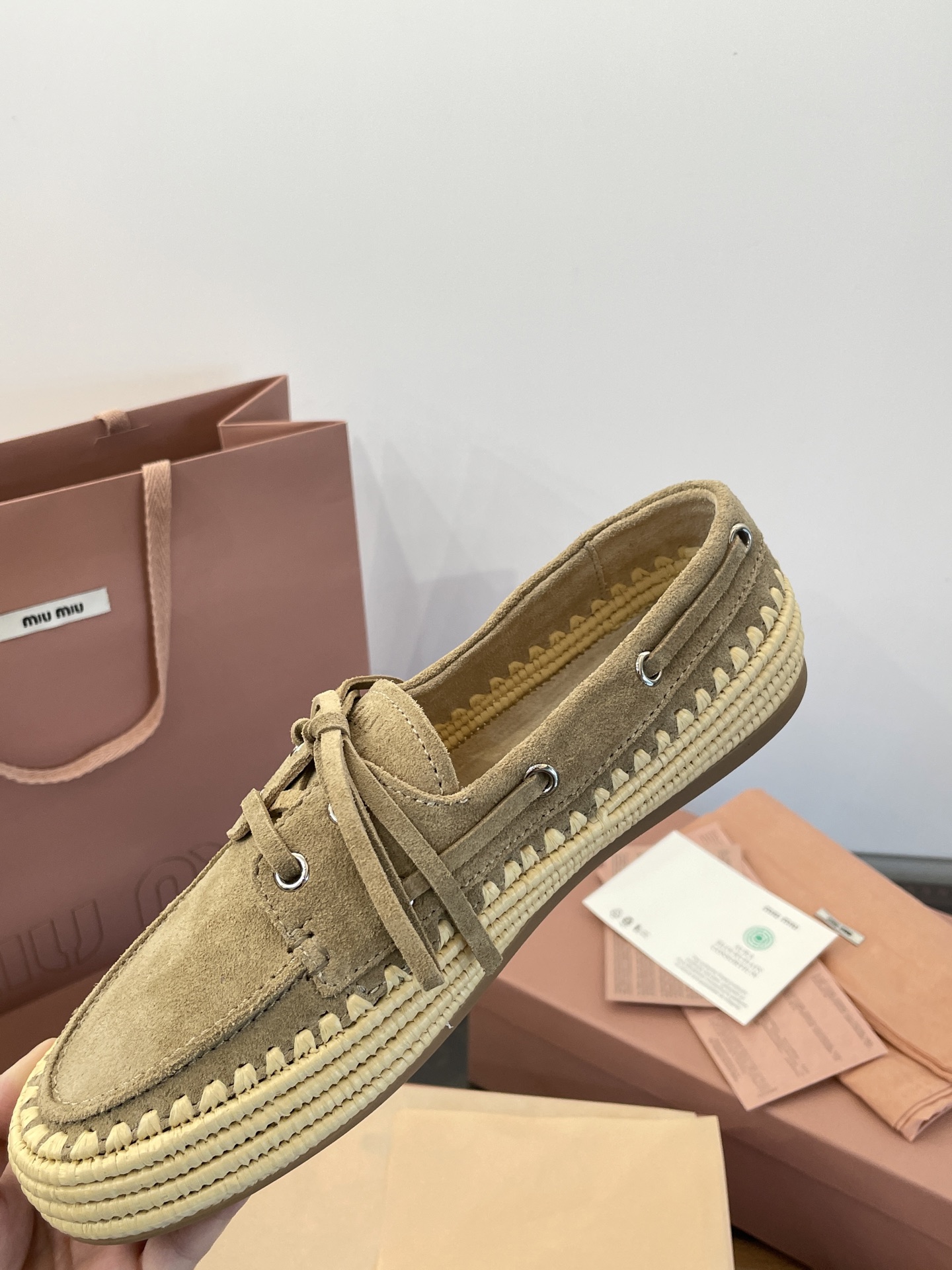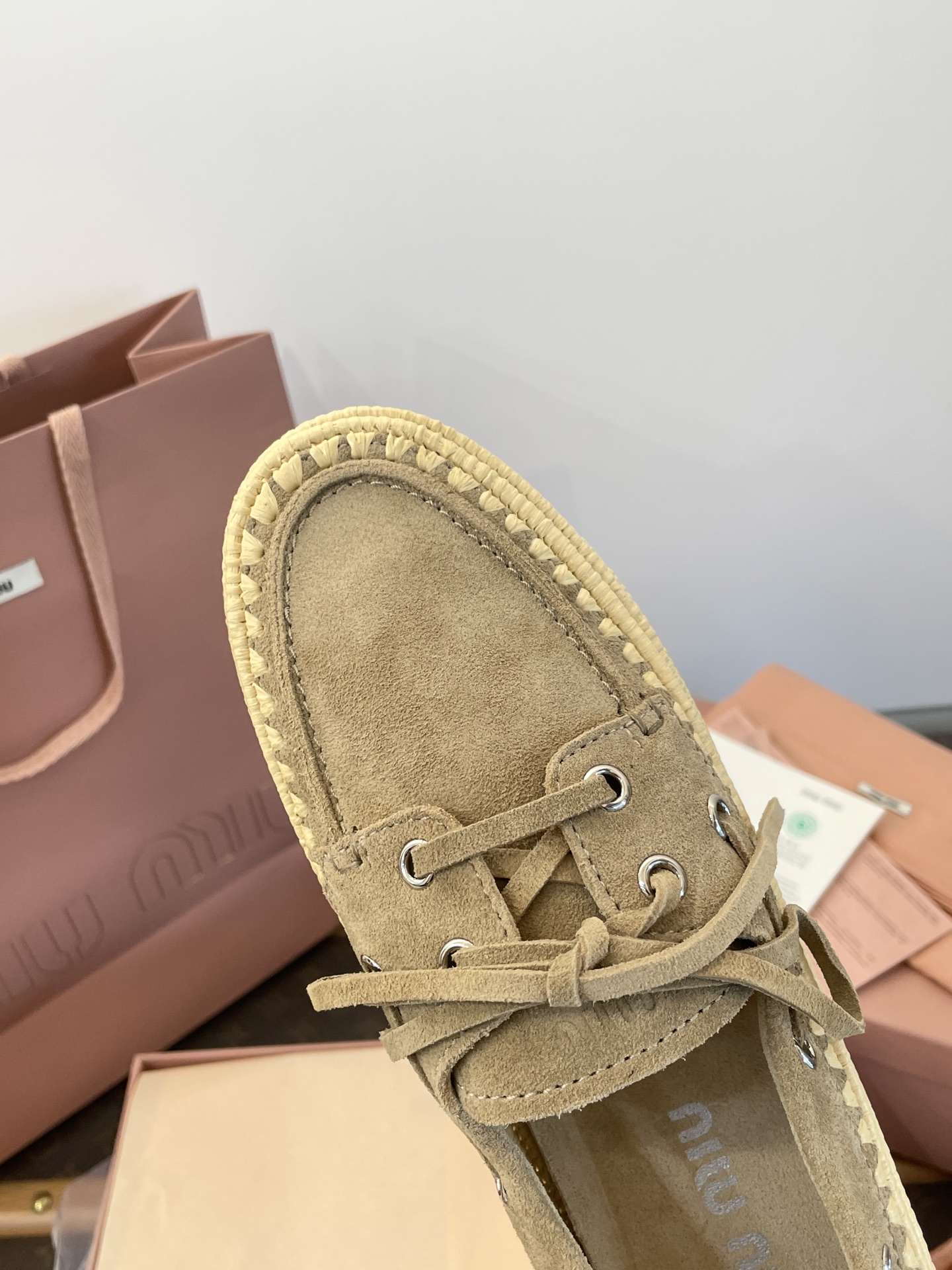 Miu家 綁帶拉菲草編麂皮帆船鞋