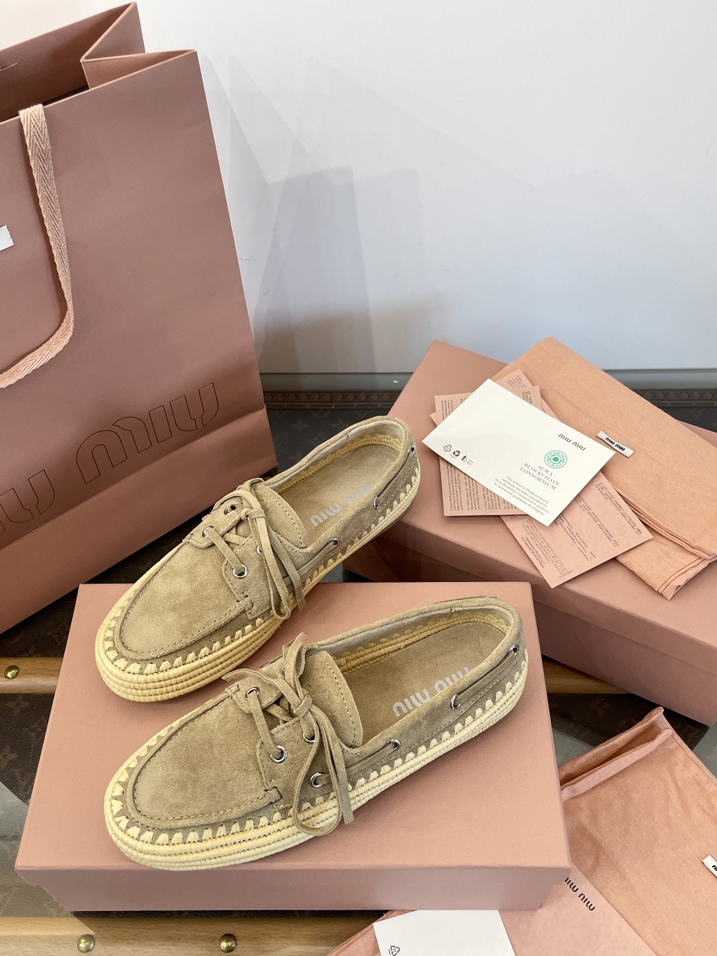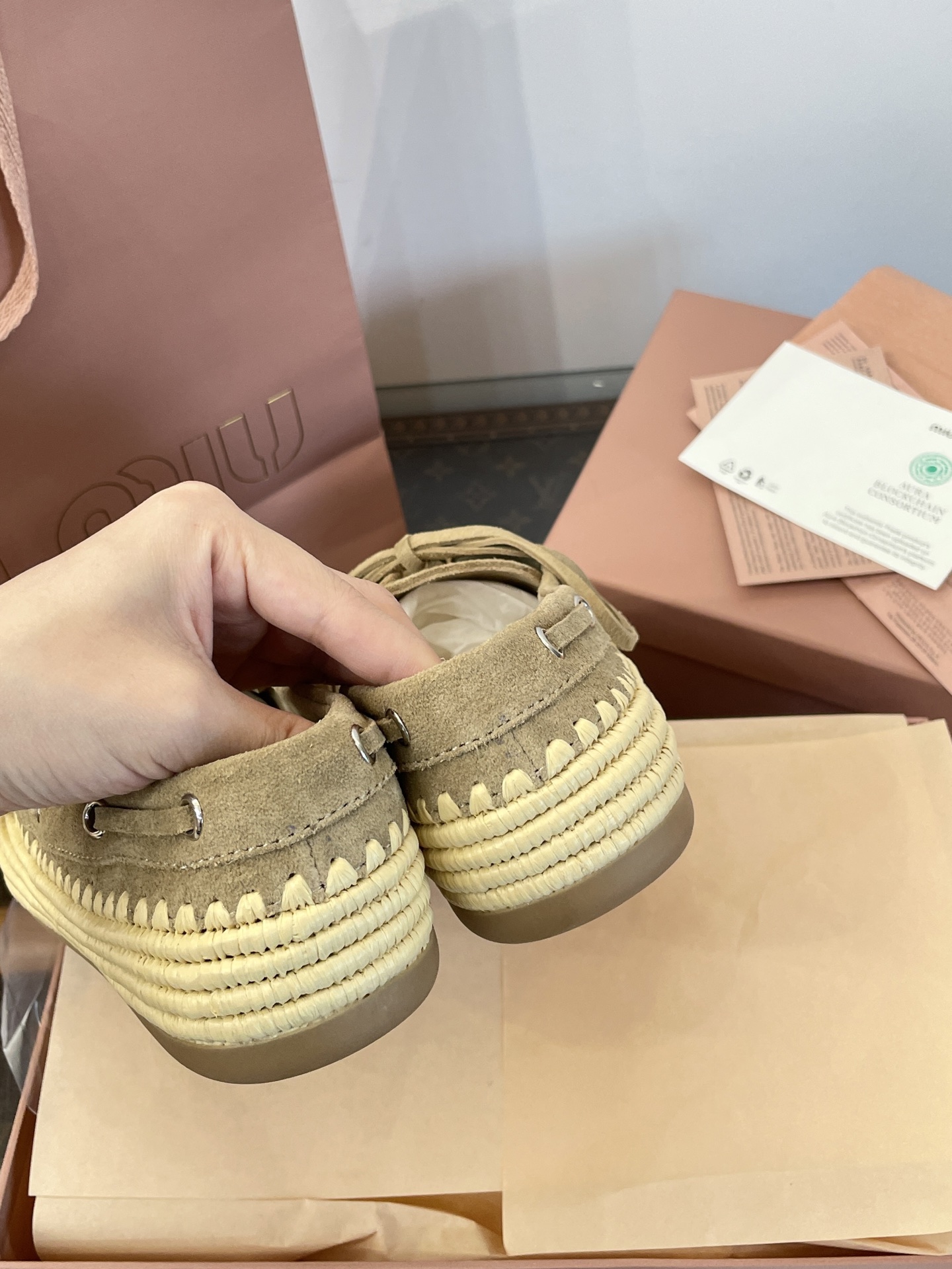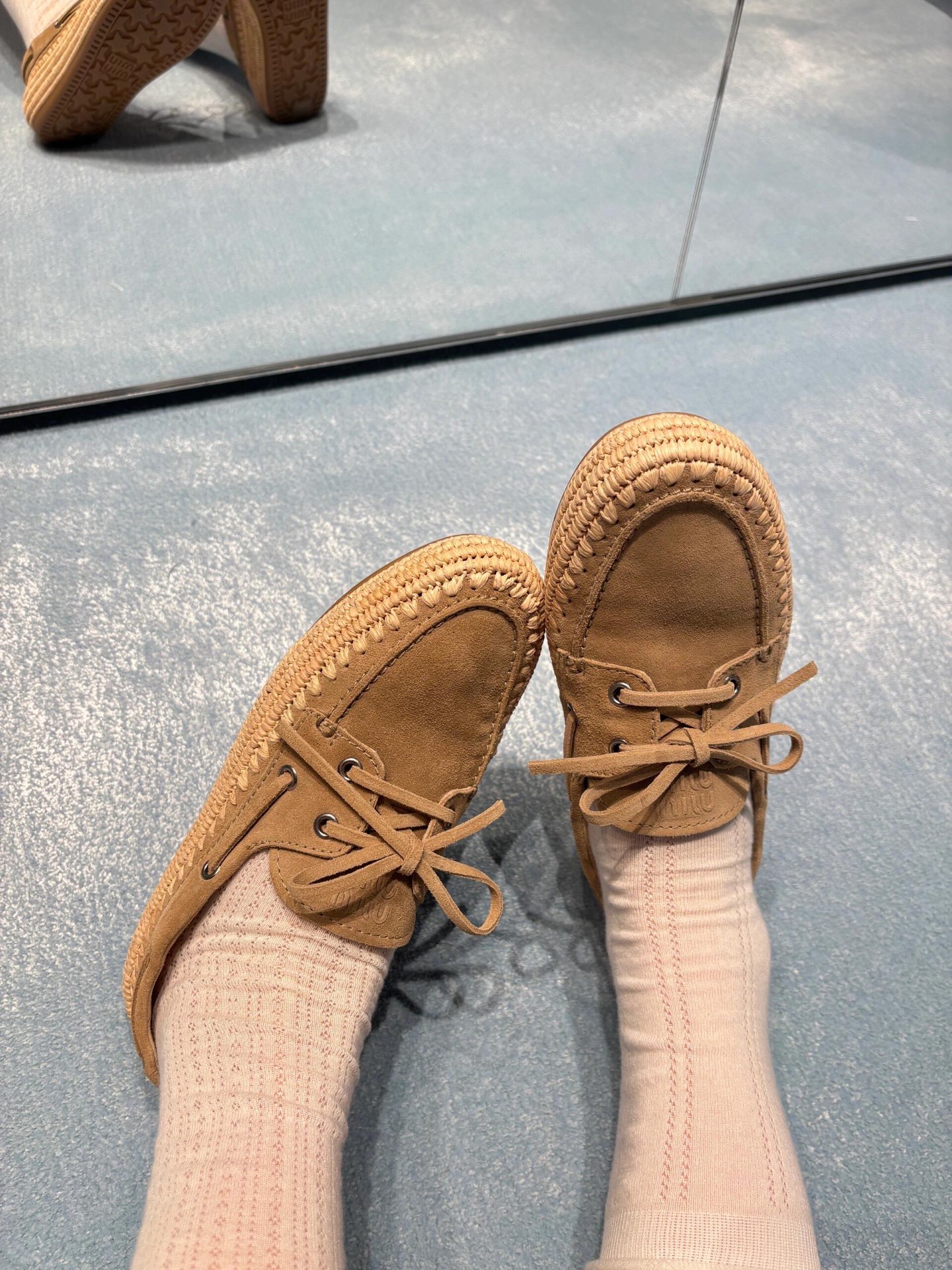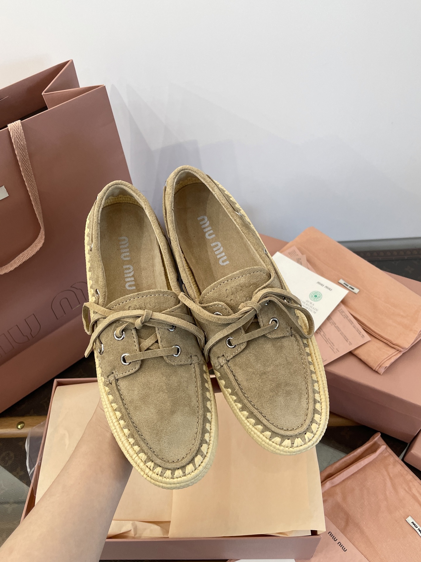 Miu家 綁帶拉菲草編麂皮帆船鞋