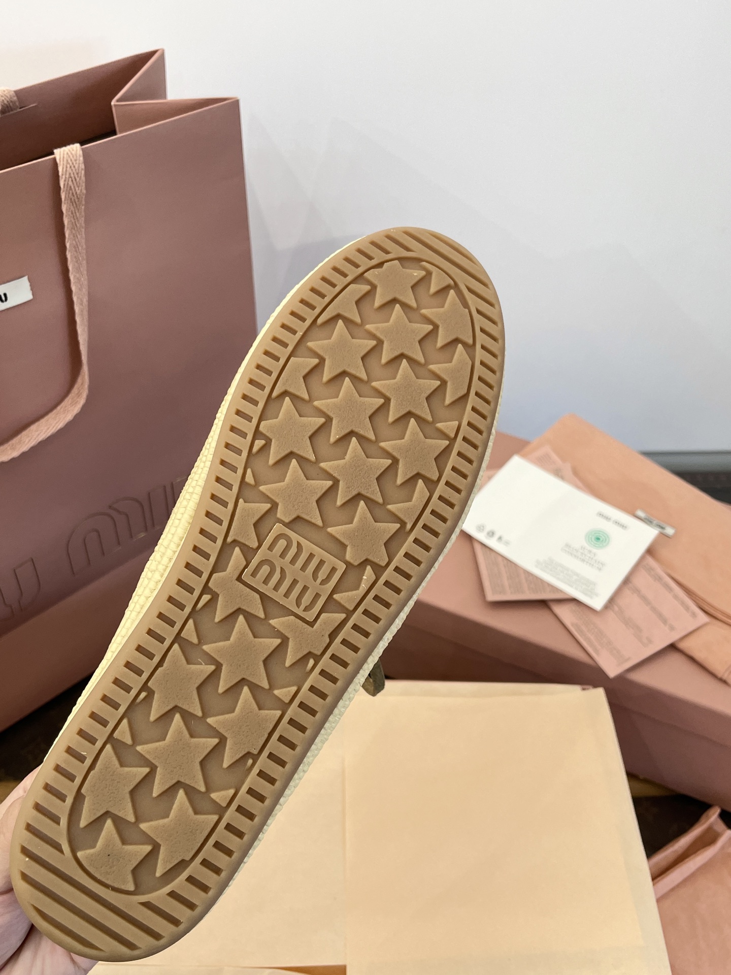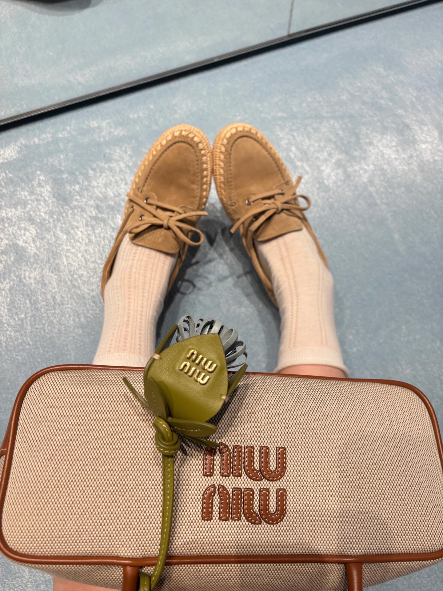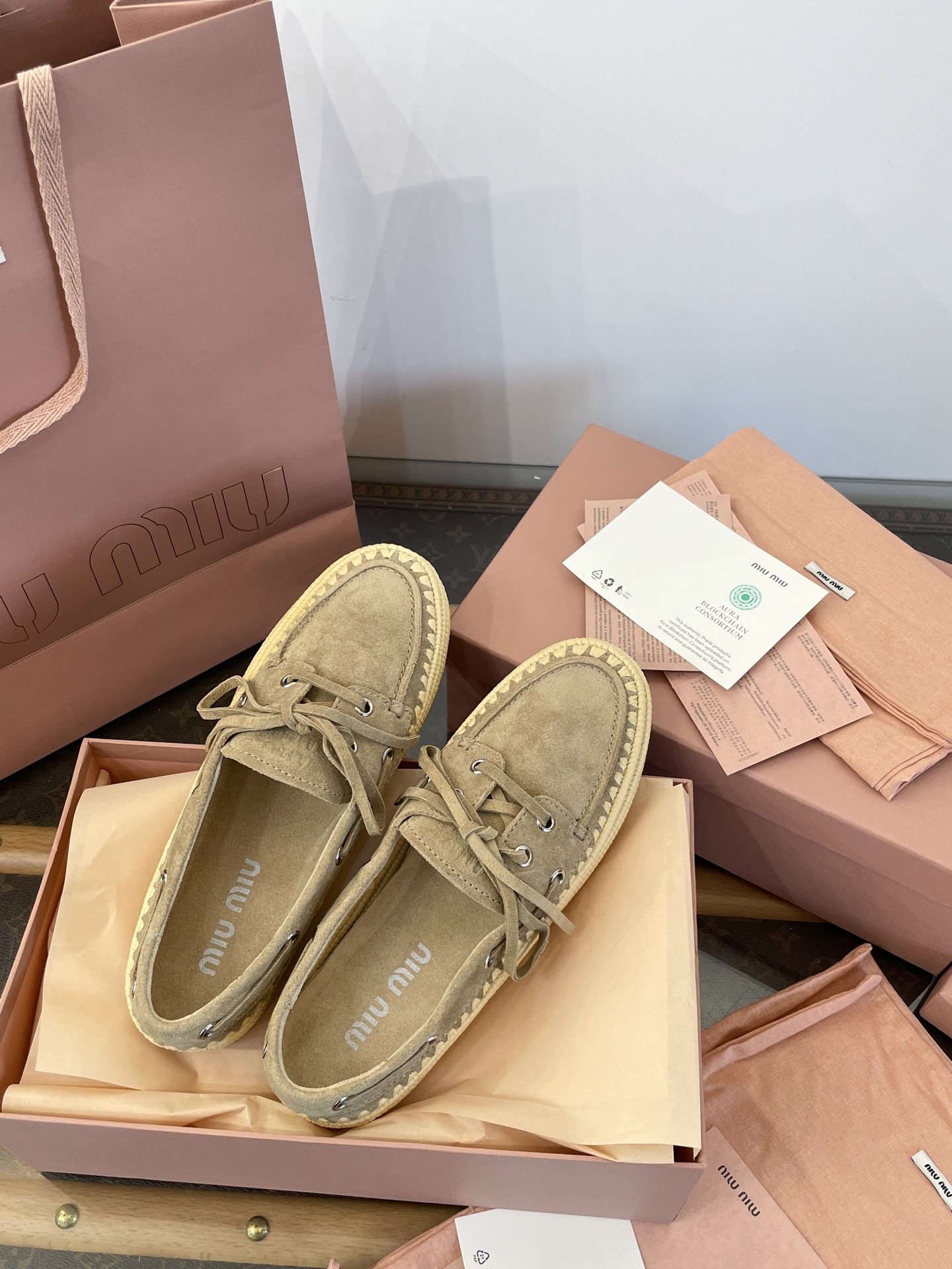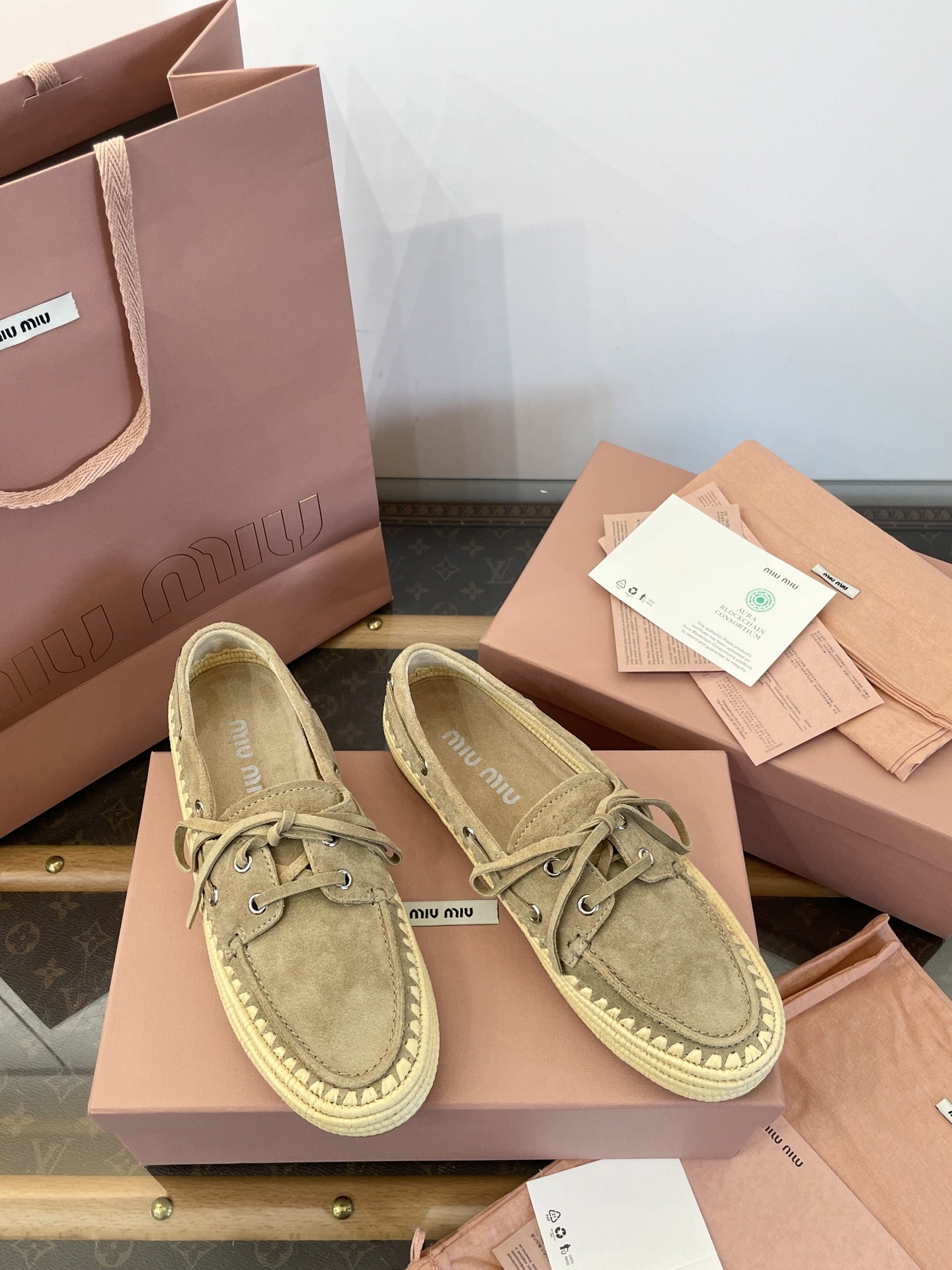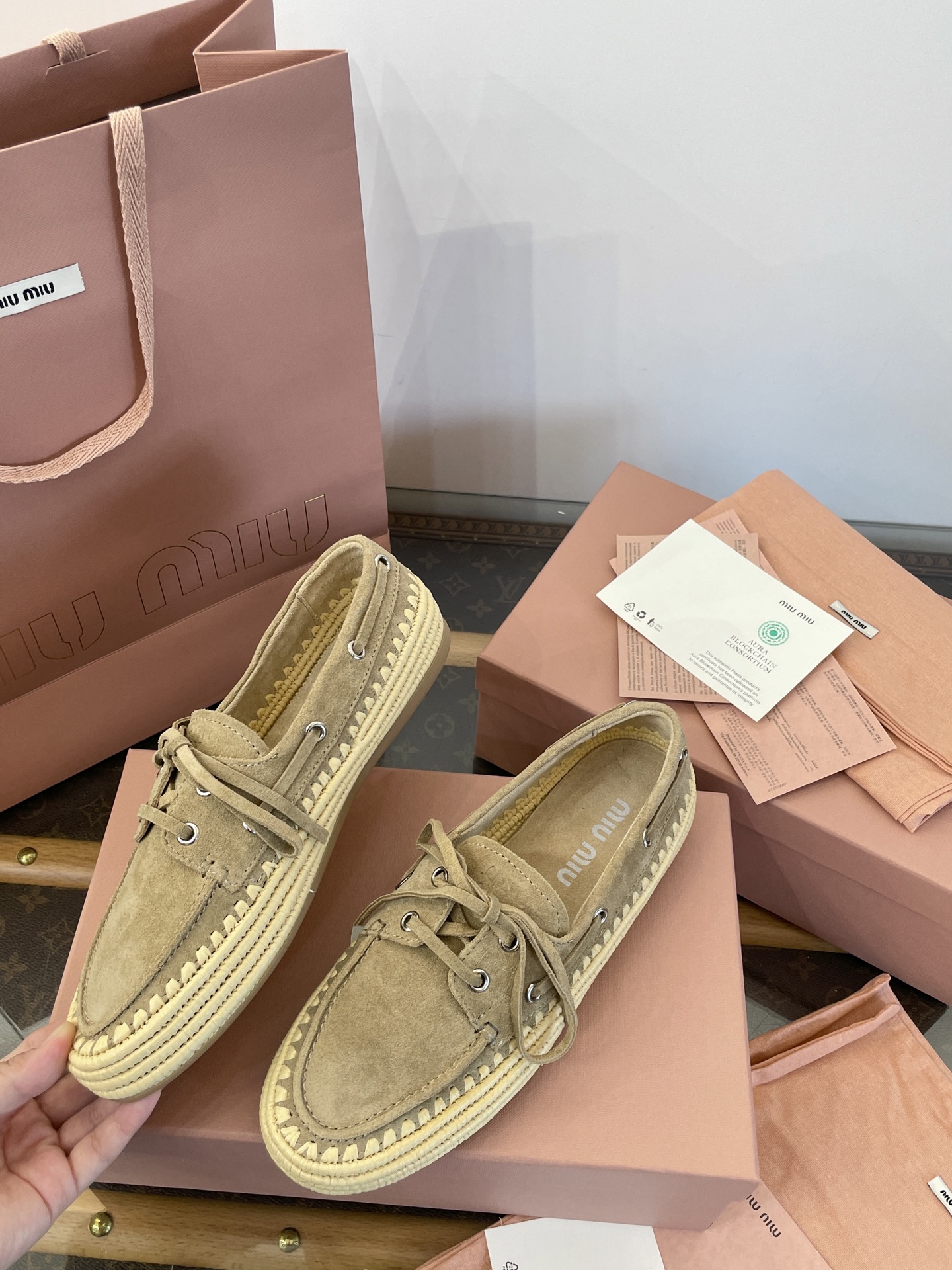Miu家 綁帶拉菲草編麂皮帆船鞋