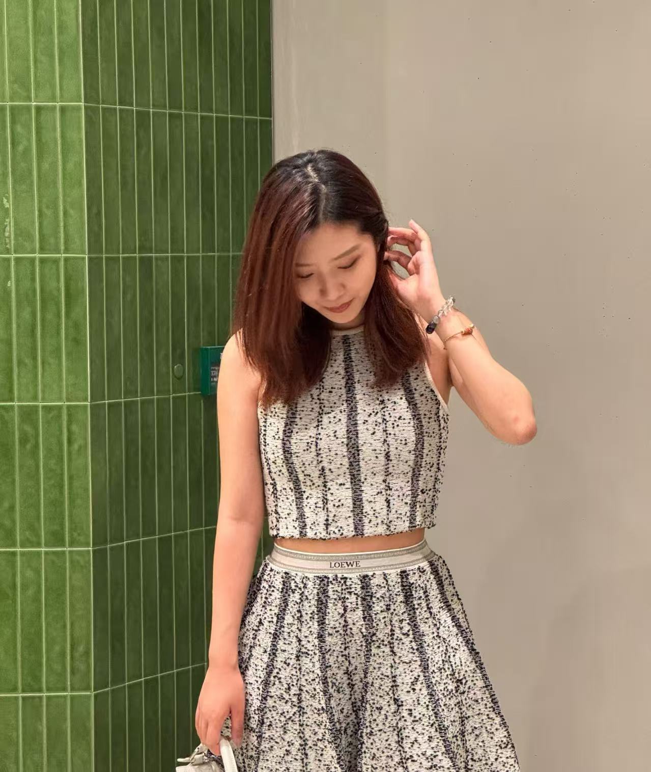 編織紋理細膩且充滿立體感,背心的剪裁修飾肩頸線條,搭配同色系的半裙,視覺上非常顯瘦且拉長比例。