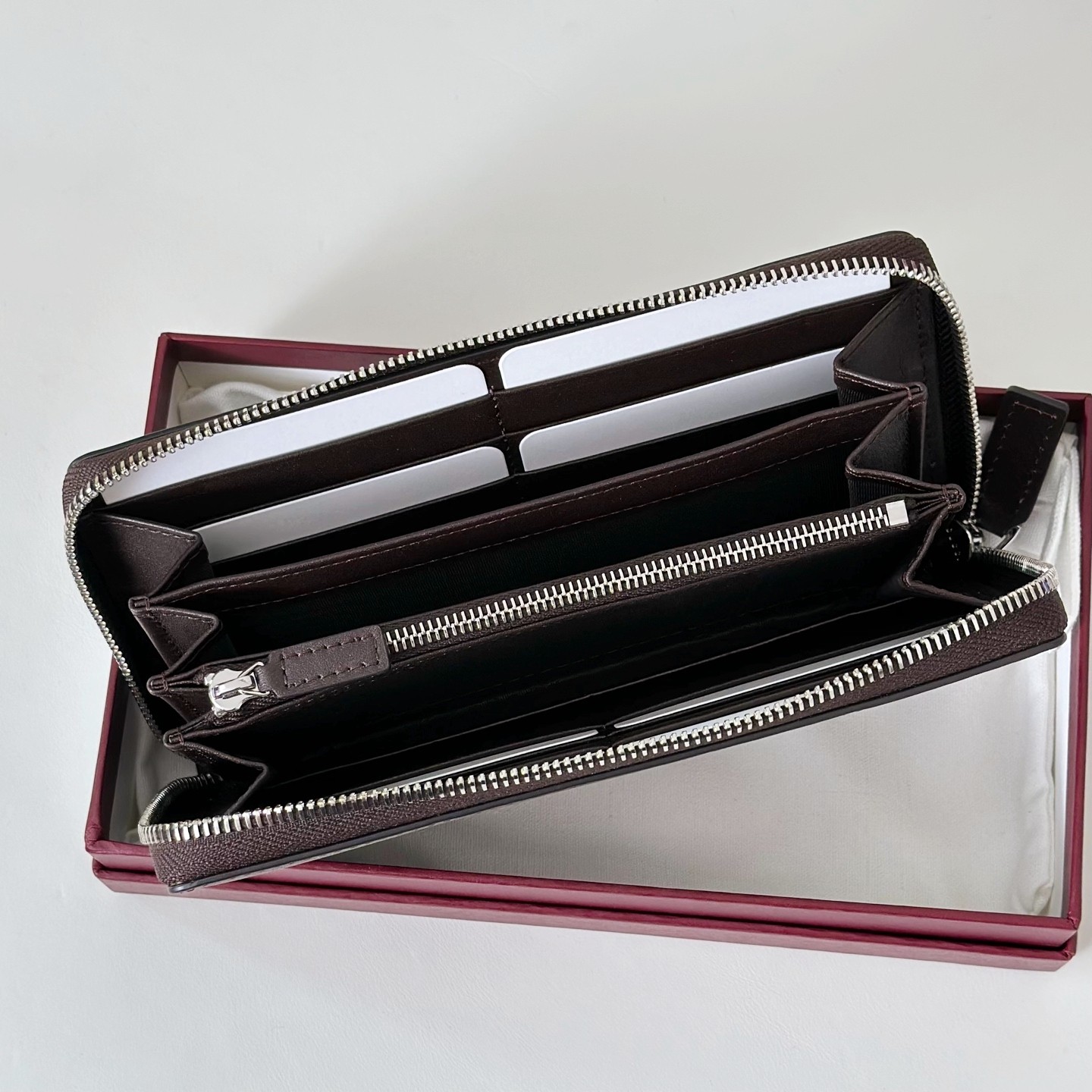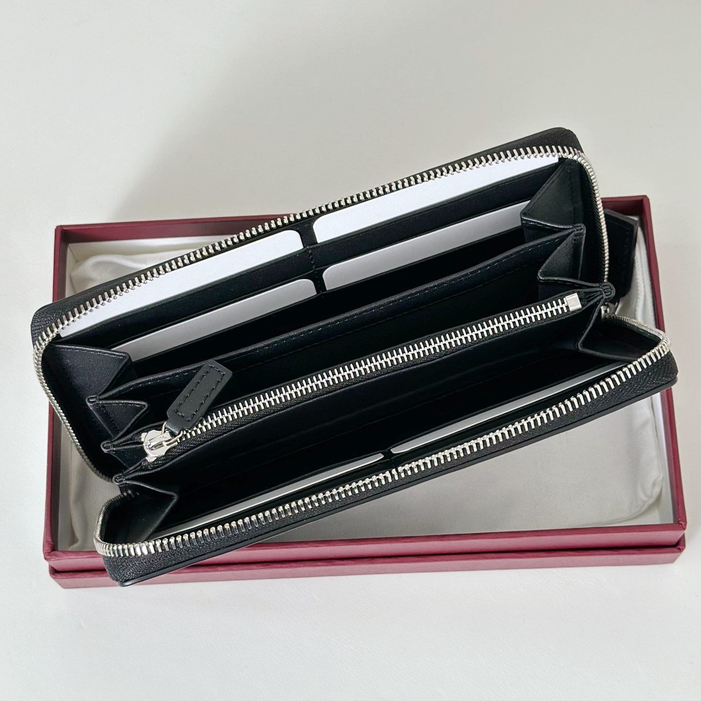 單拉鍊設計讓收納更加安全,也提升整體俐落度,打開後一目了然,卡片、鈔票、重要文件都能有條不紊地整理好。